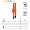 VWJK113B|Spodnie robocze na szelkach z grubą podszewką, powlekane poliuretanem, przeciwdeszczowe, ostrzegawcze o intensywnej widzialności, dostępne w dwóch kontrastowych kolorach: |VWJK113BON – fluorescencyjnym pomarańczowym/granatowym|VWJK113BYN – fluorescencyjnym żółtym/granatowym|• Spodnie są wykonane z tkaniny 100% poliestru 300D „OXFORD”, powlekanego poliuretanem|• Podszewka cienka - 100% poliestru „Taffeta” 190T|• Pikowana podszewka – 100% poliestru 140 g/m?|• Wodoodporne z szytymi i zgrzewanymi szwami|• W pasie dwie naszywane skośne kieszenie na ogrzanie rąk|• Na klapie przedniej, na piersi duża kieszeń zapinana na zamek błyskawiczny, tylna klapa ( niższa od przedniej ) spełnia rolę osłonową pleców podczas głębokiego nachylania się|• Szelki w tylnej części przyszyte do tylnej klapy spodni wykonane z taśmy rozciągliwej – gumowej ( na plecach połączone klamrą spełniającą funkcję elementu krzyżującego )|• Z przodu szelki wyposażone w regulatory długości i zakończone klamerkami łączącymi się z gniazdami klamerek przyszytymi do górnej krawędzi przedniej klapy spodni|• Na prawej nogawce z boku kieszeń podłużna na miarkę składaną|• Elastyczne ściągacze w pasie |• Nogawki na dole poszerzane poprzez użycie zamka błyskawicznego po zewnętrznej części łydki|• W pasie po bokach umieszczone są, dla wygody zakładania, dwa zamki błyskawiczne regulujące obwód talii|TAŚMA ODBLASKOWA:|• Dwie taśmy odblaskowe umieszczone dookoła łydek i jedna w pasie|PODŁOŻE TAŚMY: |• 100% poliestru, z powłoką ( szklane mikrokulki ), cięcie 2”, szerokość 7 cm, kolor szary|• 25 prań w temperaturze 40°C, 5 prań na sucho – dotyczy taśm odblaskowych|CERTYFIKATY:|MATERIAŁ: EN ISO20471:2013 Klasa 2 EN343:2003+A1:2007 Klasa 3 1|TAŚMA ODBLASKOWA: EN ISO20471:2013|UBRANIE: EN ISO20471:2013 Klasa 2 EN343:2003+A1:2007 |? Wodoszczelność Klasa 3|? Opór dla pary wodnej 1 |ROZMIARY: XS – XXXL ( jeden rozmiar więcej )|||