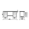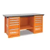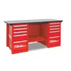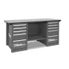- Stół z dwiema szafkami z szufladami. Każda szafka narzędziowa posiada 5 szuflad z prowadnicami kulkowymi, o wymiarach 588x367 mm, 3 o wysokości 90 mm, 1 o wysokości 180 mm i 1 o wysokości 280 mm. Wyposażona jest w centralny zamek. Do szufladpasują wkłady profilowane na narzędzia. Blat roboczy z drewna klejonego wielowarstwowo, laminowanego tworzywem sztucznym, posiada trzy otwory służące do mocowania imadła 1599F/150 (do zamówienia oddzielnie).