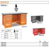 - Stół z dwiema szafkami z szufladami. Każda szafka narzędziowa posiada 5 szuflad z prowadnicami kulkowymi, o wymiarach 588x367 mm, 3 o wysokości 90 mm, 1 o wysokości 180 mm i 1 o wysokości 280 mm. Wyposażona jest w centralny zamek. Do szufladpasują wkłady profilowane na narzędzia. Blat roboczy z drewna klejonego wielowarstwowo, laminowanego tworzywem sztucznym, posiada trzy otwory służące do mocowania imadła 1599F/150 (do zamówienia oddzielnie).