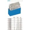 Znaczniki stalowe do znakowania detali z siłą do 1200 N/mm2 krój czcionki zgodny z normą DIN 1451 Znaczniki wykonane z wysokiej jakości stali narzędziowej wykończenie powierzchni gładko-matowe każdy znacznik jest opisany: - odciskany symbol - wysokość znaku - Made in Germany - międzynarodowy znak ochrony oczu - twardość na grawerce 58-60 HRC - wysokość znaku: od 1 do 15 mm - zestawy pakowane w pudełka z niebieskiego tworzywa sztucznego